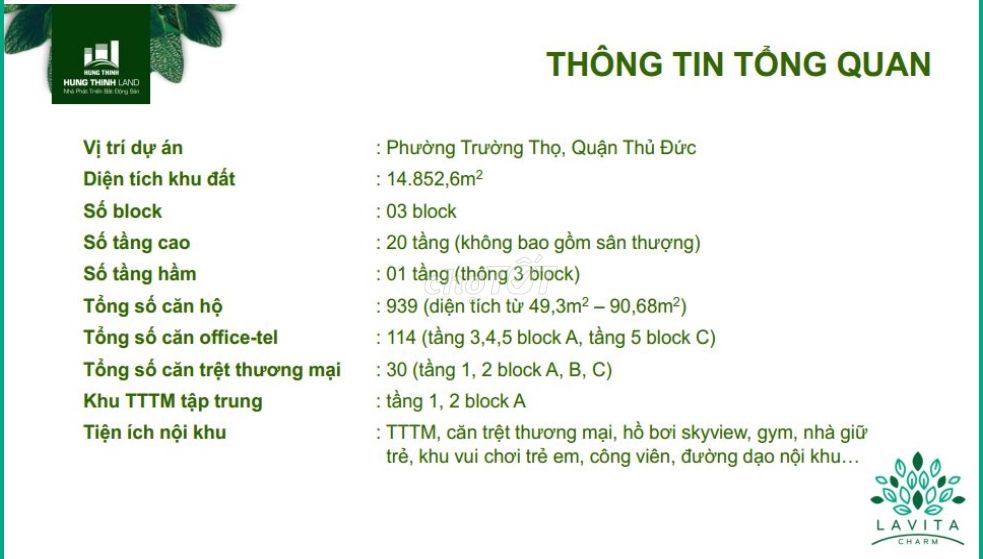 Số lượng căn hộ: 939 căn (Thiết kế từ 49,30m2 – 90,86m2) – Thiết kế Lavita Charm Số lượng Offictel Lavita Charm: 115 căn – Thông tin Officetel Lavita Charm Số lượng Shop House Lavita Charm: 28 căn – Thông tin Shop Lavita Charm Đơn vị thi công: Hưng Thịnh Cons (thuộc Hưng Thịnh Corp) Ngân hàng bảo lãnh tiến độ và hỗ trợ vay vốn: TPBank – Xem thêm chính sách vay Ngân hàng Nội thất bàn giao: Nội thất đầy đủ căn bản – Xem thêm Danh mục nội thất bàn giao Lavita Charm Tiện ích: Hồ bơi Skyview, công viên, TTTM, nhà trẻ, hầm gửi xe, Cafe thư giãn, Công viên trên cao… Thời gian sở hữu: lâu dài sổ Hồng – Pháp lý căn hộ Lavita Charm